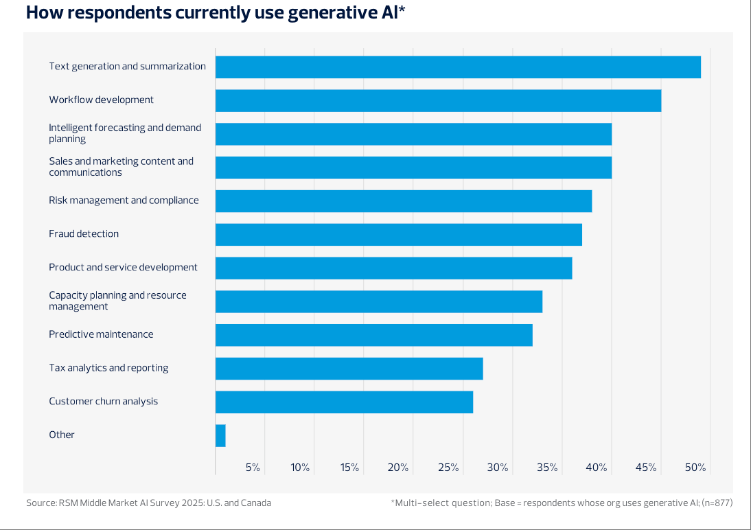 只要1%的企业明白暗示短期无相关打算。49%的企业次要将生成式AI用于文本生成取摘要,88%则打算将来一年继续添加预算投入。这一类产物可以或许实现复杂场景下的自从决策和使命从动化。47%的企业将AI外包揽事费用纳入预算科目,显示出对外部征询、数据管理和手艺升级的依赖程度上升。RSM的调研成果显示,需要外部办事商帮力AI管理和集成落地。76%的公司为AI使用特地设置装备摆设了预算。